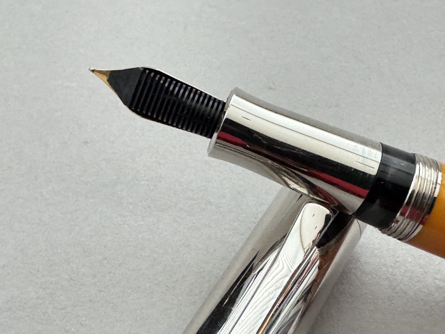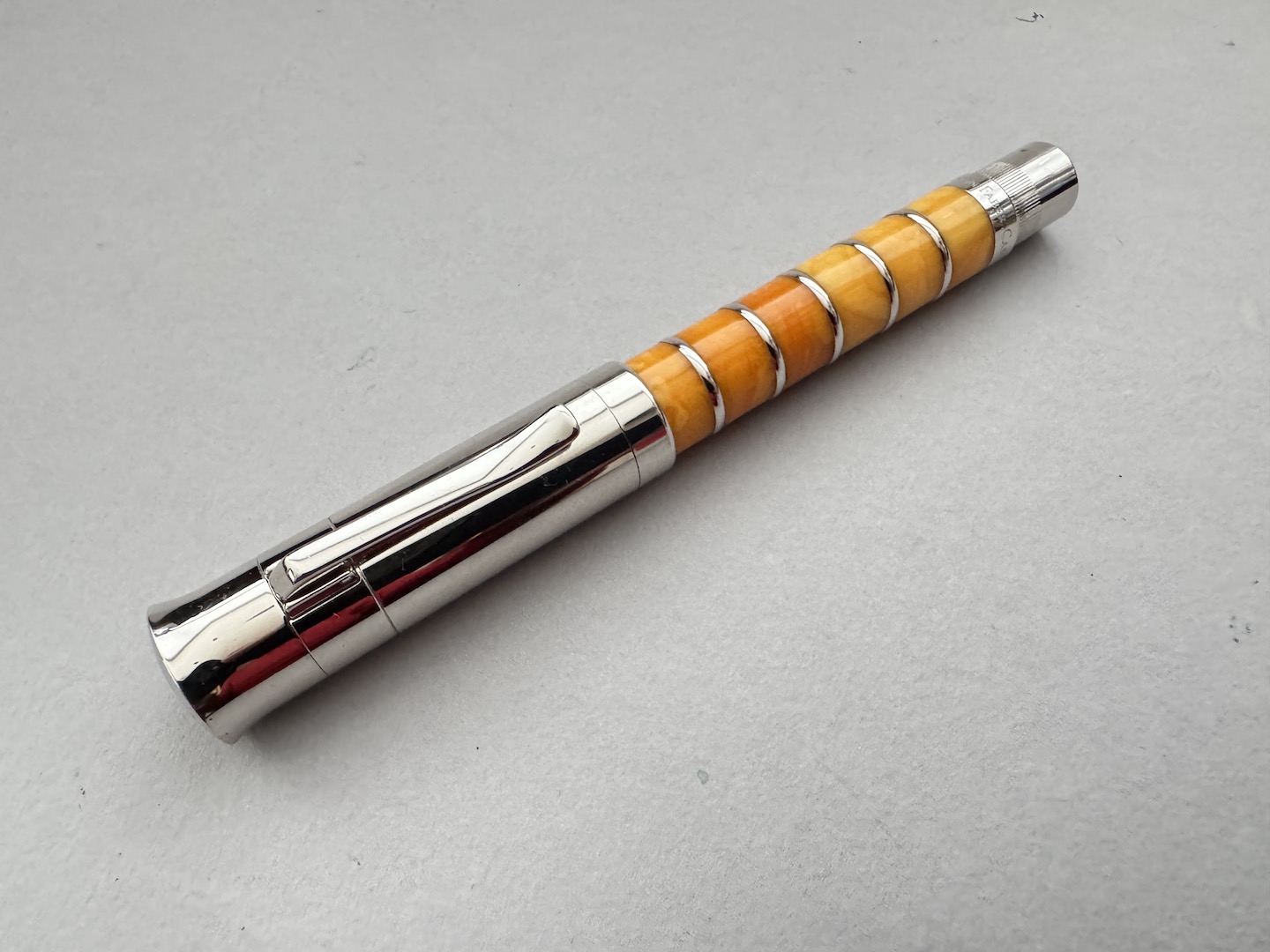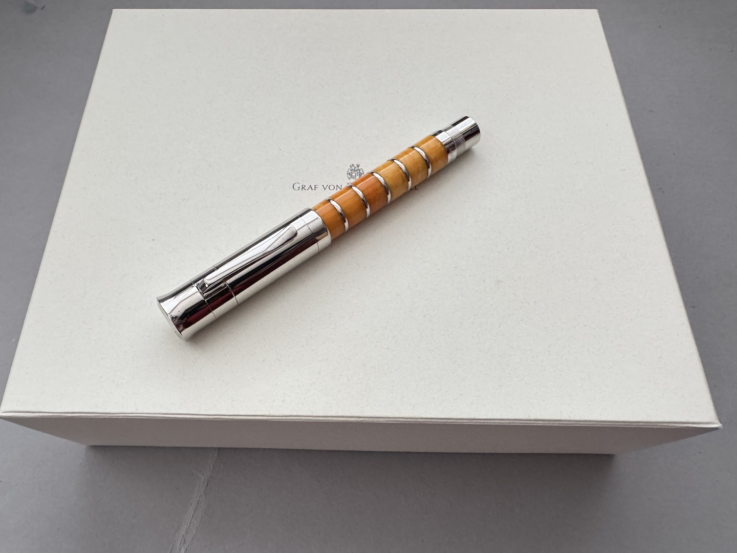 The 2004 Pen of the Year by Graf Von Faber Castell is one of the most popular of the series; each pen has a unique shade of amber combined with a smooth platinum finish; it is a classy and eye-catching combination. It comes with a fine 18k gold nib. The striking new fountain pen featuring amber rings to the barrel presented a technical challenge. Who else than the Amber Room’s restorers could better master this challenge? The master craftsman and head of the workshop, Boris Igdalov, who personally took care of the creation of this fountain pen, created a new work of art that competes with the craftsmanship and love of details of the artistic inlay and carvings of the Amber Room. All amber rings are individually processed, polished, and combined with platinum rings. There is a fascinating interplay between two materials that is repeated in total between the platinum-plated cap and the amber barrel. Apart from this interplay, it is mainly the high-quality craftsmanship, the individual grain of the amber rings and their different colors that make every fountain pen a unique piece of personal value.
