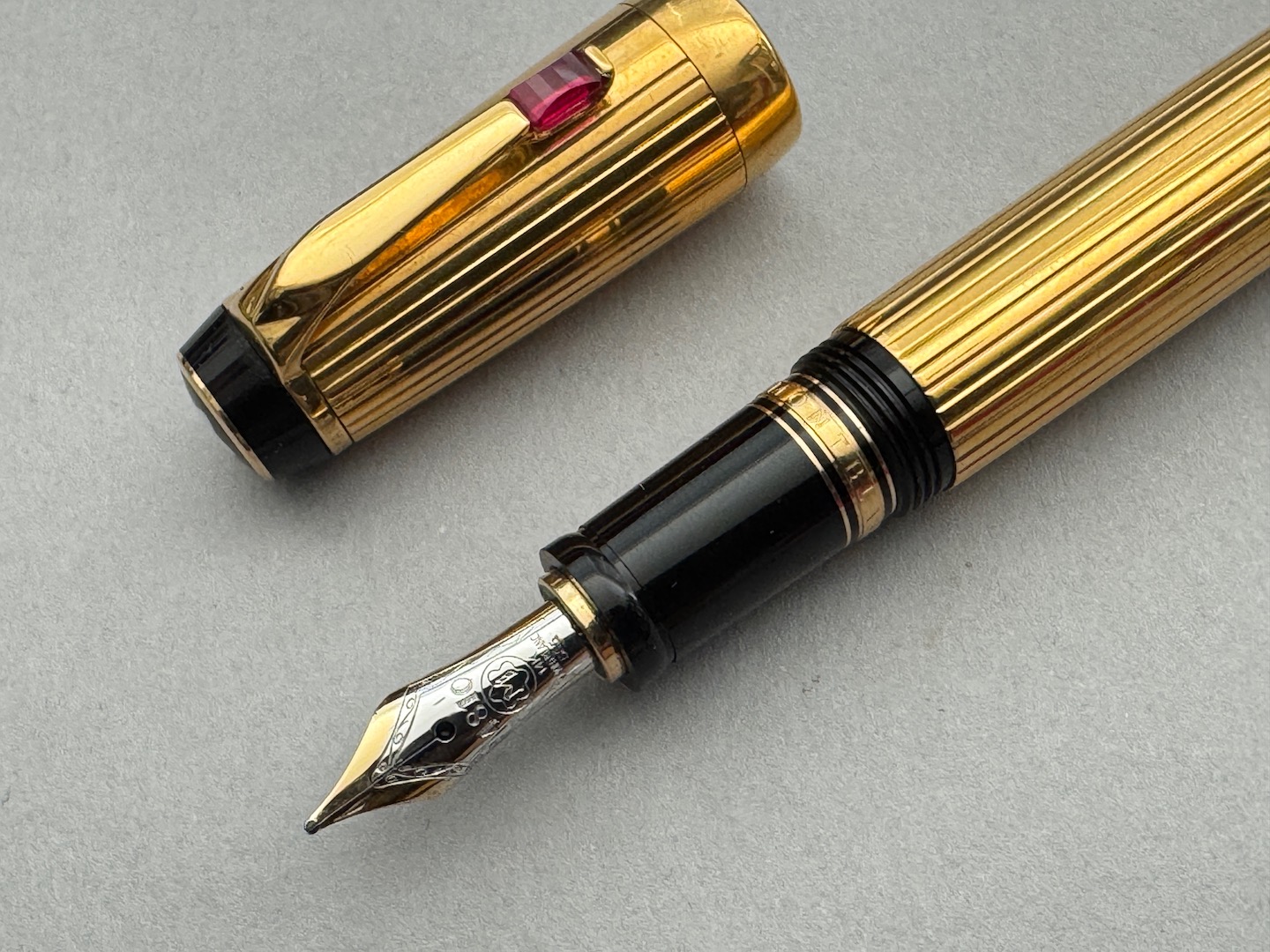Here we have a Montblanc Boheme Gold Plated Rouge Stripe retractable fountain pen; produced in the year 2000, fitted with an extra fine 18kt gold two-tone nib. the pen is in excellent condition, with no issues, and is presented in its original inner and outer box and service papers.
