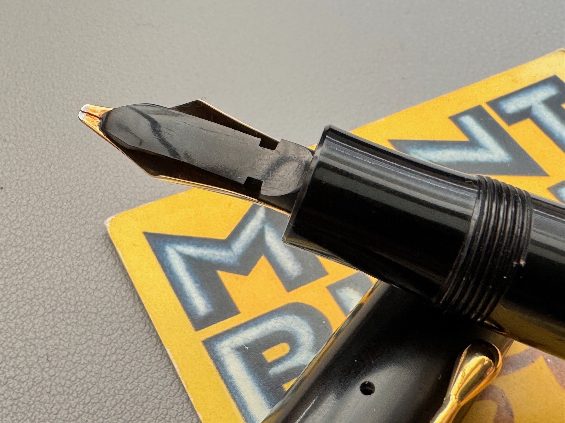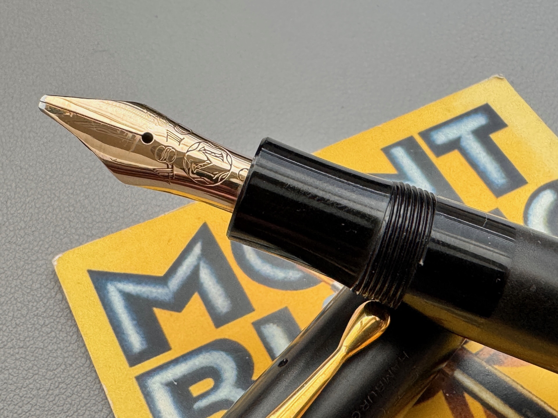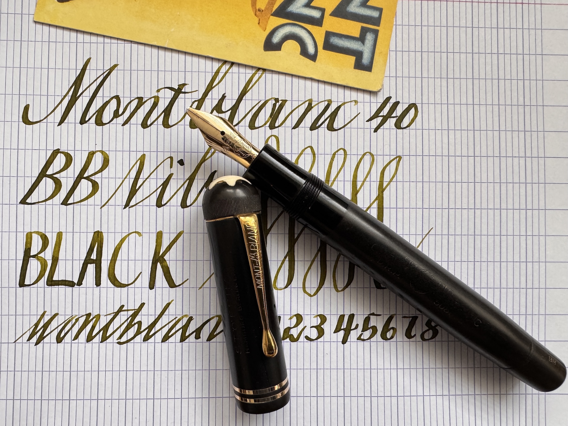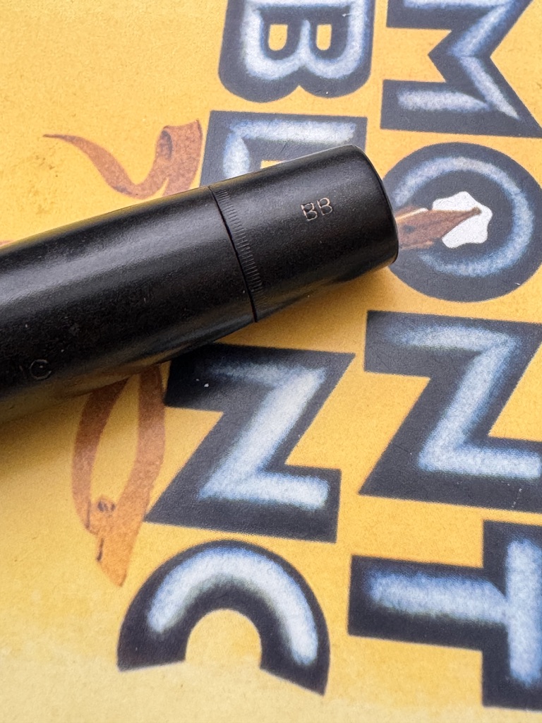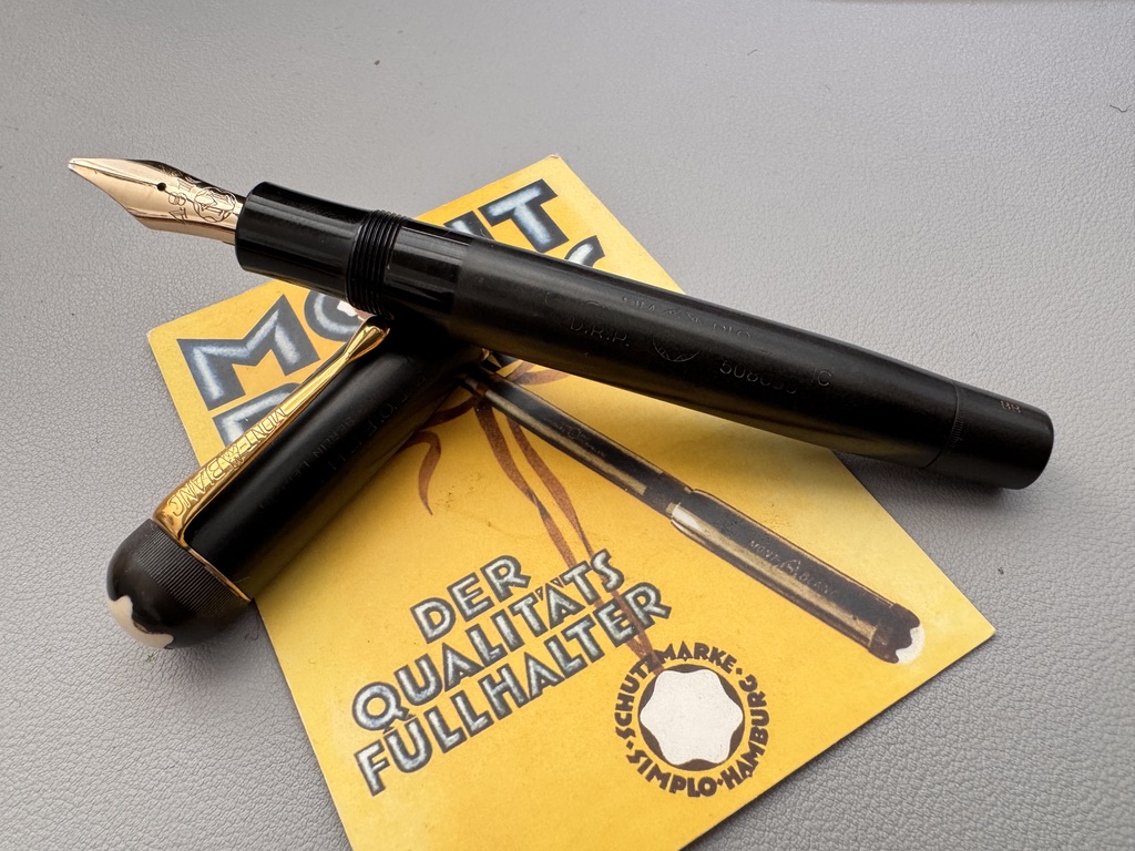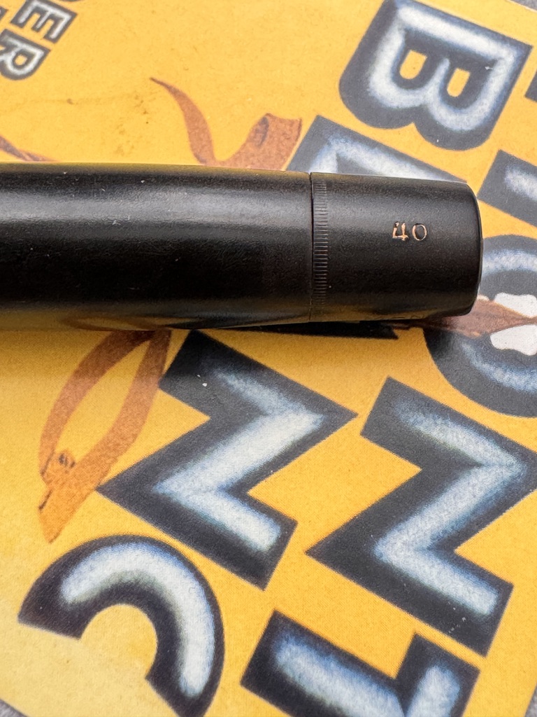 Here we have a rare example of the Montblanc Meisterstuck No 40 push knob filler fountain pen, made of hard rubber and produced in Germany between 1930- 1945 ( This model was also produced in Denmark for ); it is fitted with a Double Broad 14ct gold 4810- 225 nib, which corresponds with the BB indicator on the push knob and model no,40