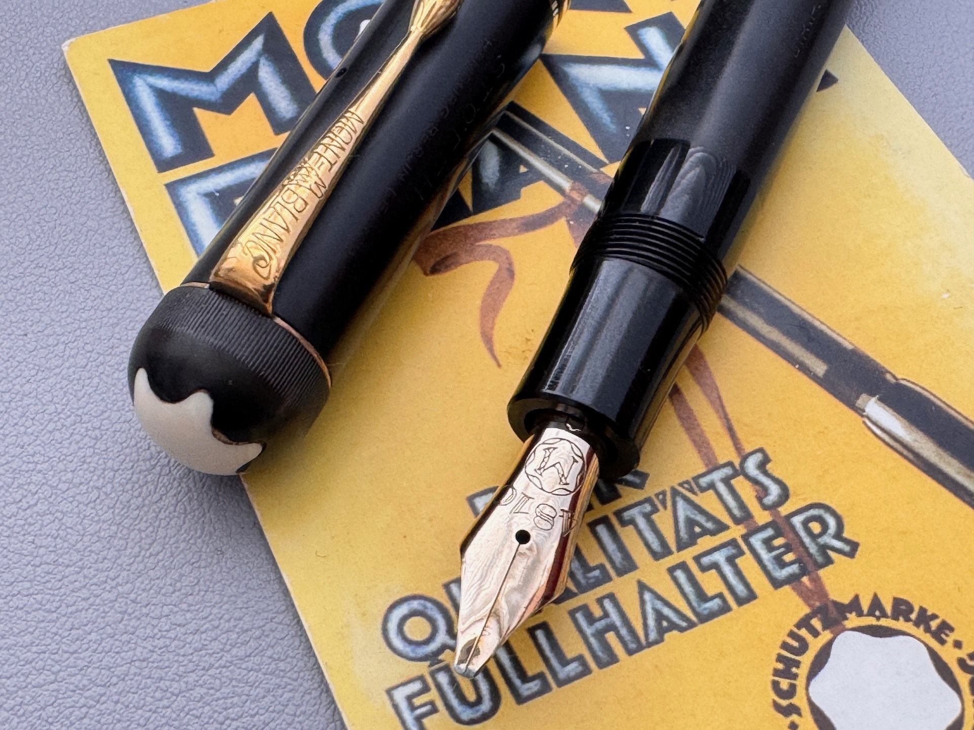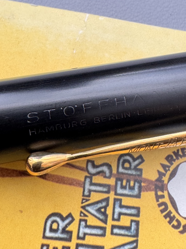 The pen is in excellent condition , no cracks or damage and has been fully restored. The imprints are readable and the cap also bears name Stoffhaas imprinted to the cap. Stöffhaas was a prominent German stationery retailer in Hamburg, Berlin, and Leipzig that partnered with Montblanc in the 1920s and 1930s. Pens branded “Stöffhaas” were manufactured by Montblanc and sold at these exclusive locations.