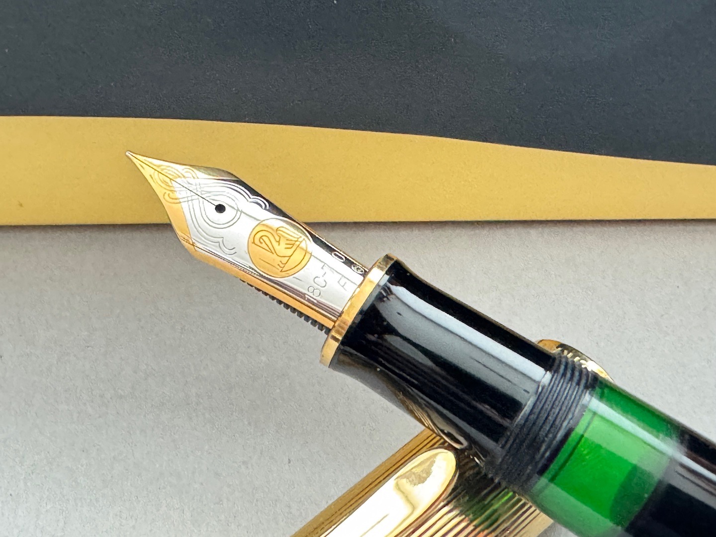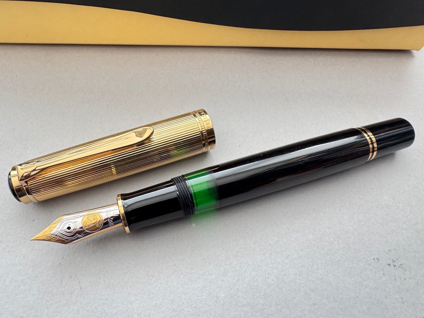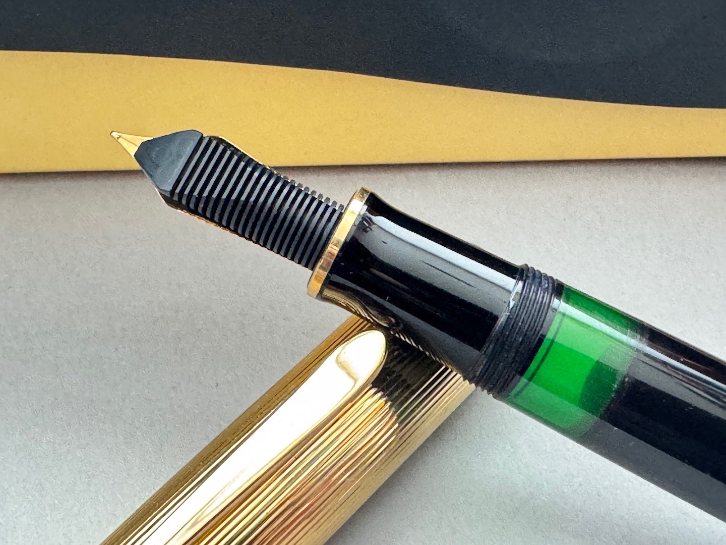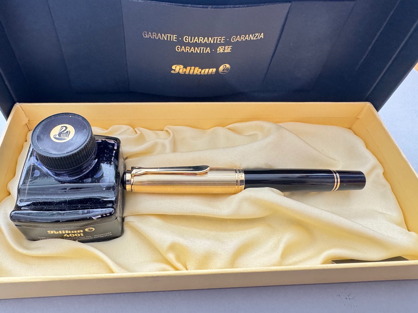 Here we have a Pelikan black and Vermeil 1050 fountain pen, produced between 1997-2001 and in near-mint condition. The pen is fitted with an 18kt gold soft fine nibĀ and is presented in its original presentation box, ink, outer box, and papers