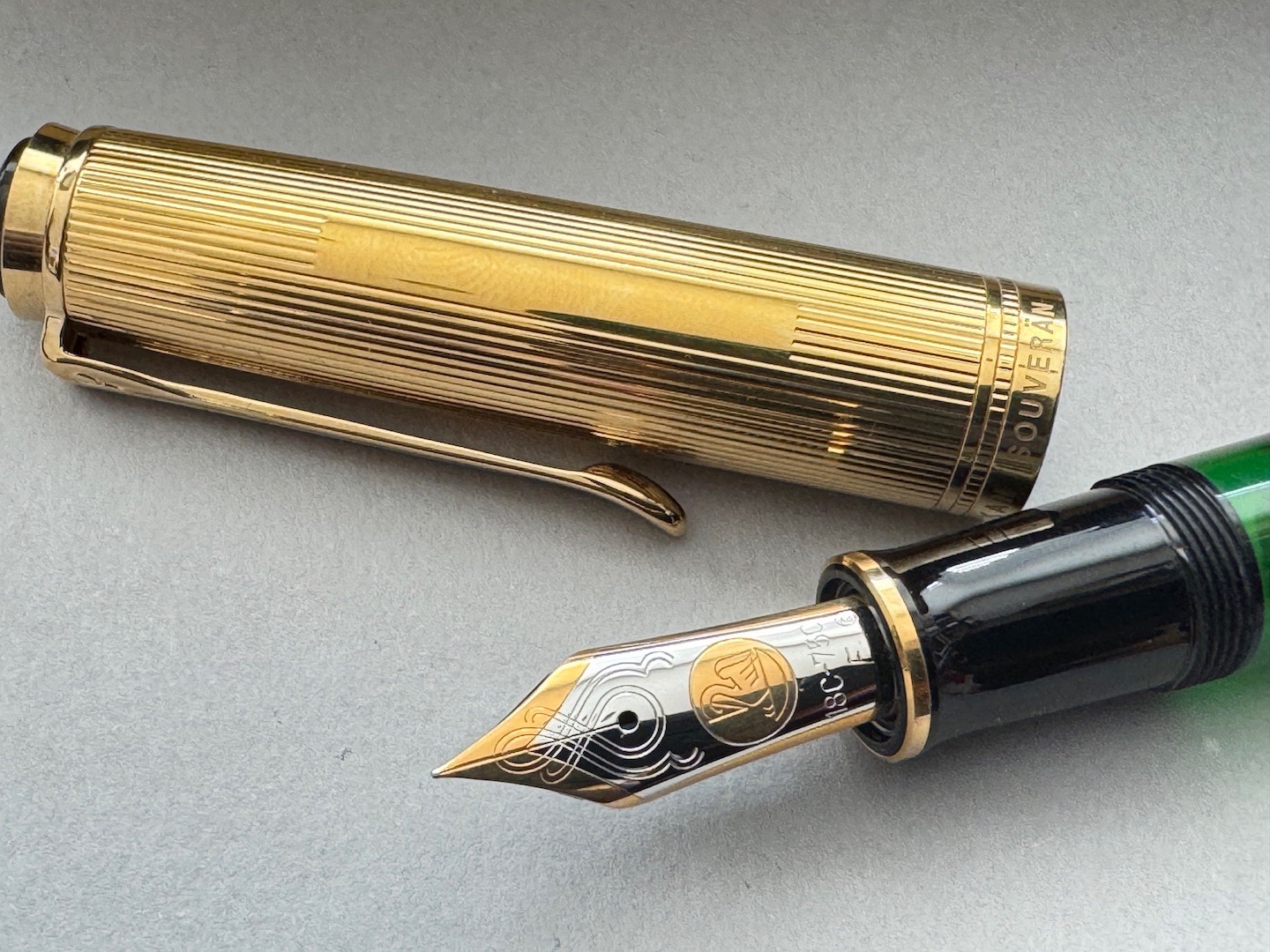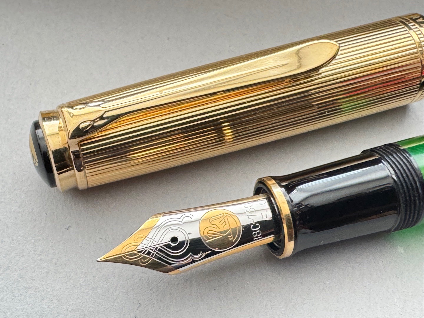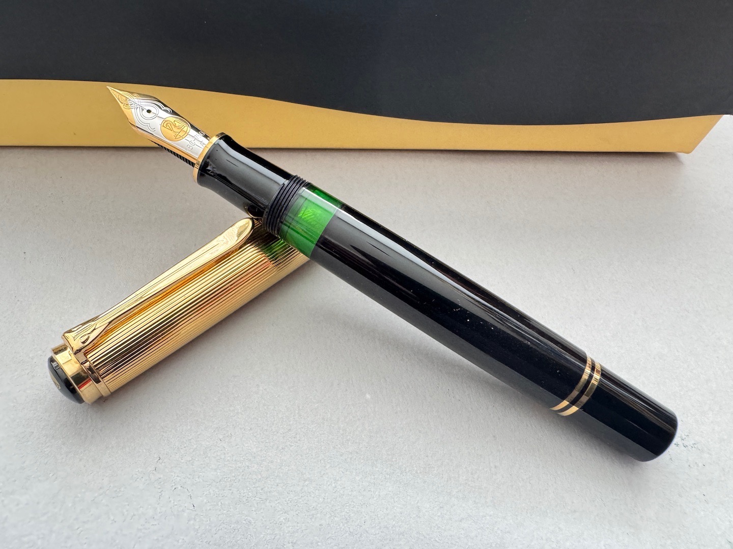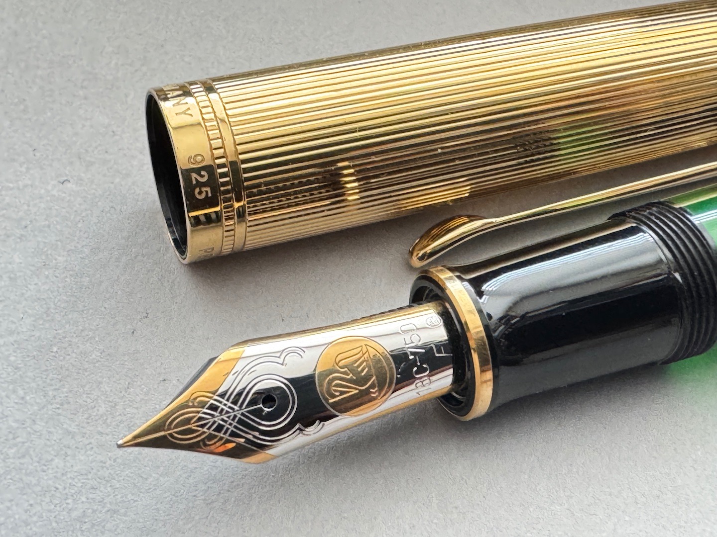 Here we have a Pelikan black and Vermeil 1050 fountain pen, produced between 1997-2001 and in near-mint condition. The pen is fitted with an 18kt gold soft fine nibĀ and is presented in its original presentation box, ink, outer box, and papers